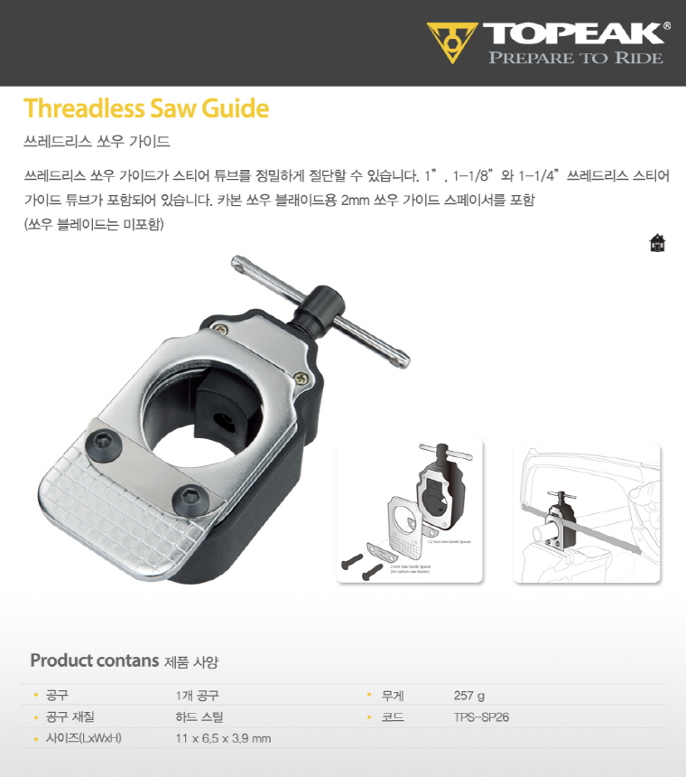 쓰레드리스 쏘우 가이드가 스티어 튜브를 정밀하게 절단할 수 있게 합니다. 1", 1-1/8"와 1/4 쓰레드리스 스티어링을 절단할 수 있게 가이드 튜브가 포함되어 있습니다. 카본 쏘우 블레이드용 2mm 쏘우 가이드 스페이서 포함 (쏘우 블레이드는 미포함) |